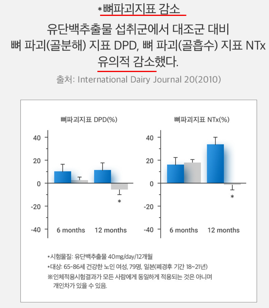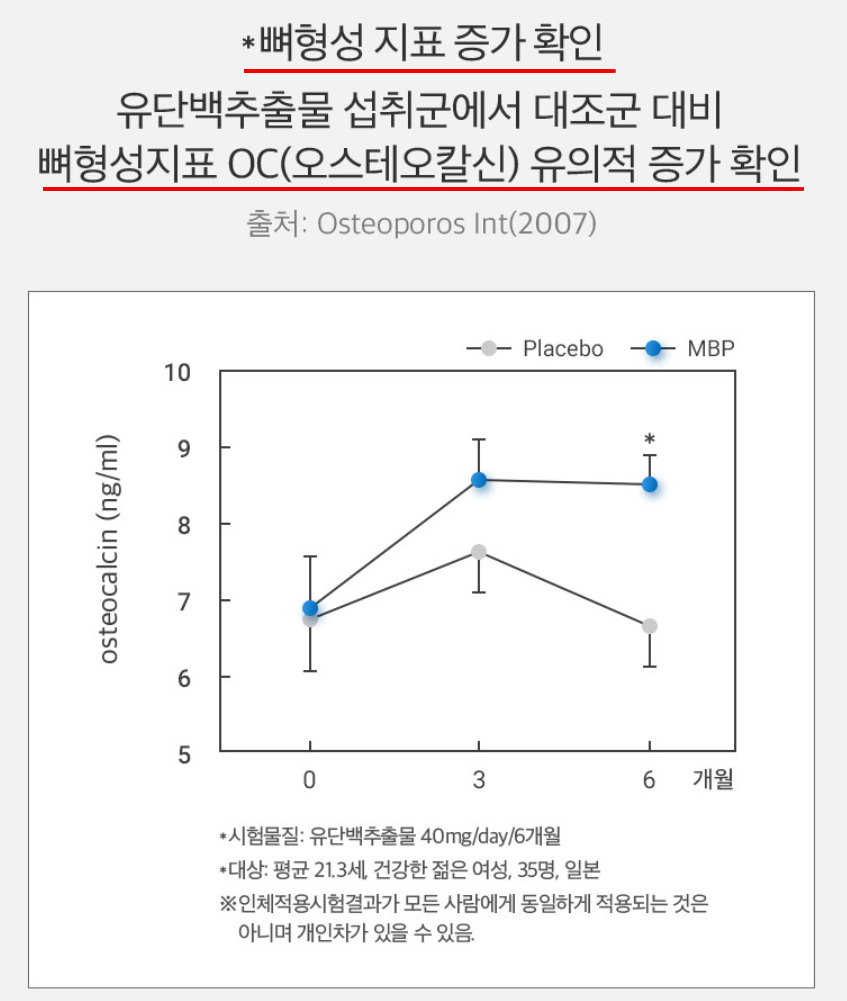 평균 21세 건강한 젊은 여성 35명을 대상으로 MBP를 6개월간 꾸준히 섭취하게 한 결과 대조군에 비해 뼈형성지표 OC(오스테오칼신)가 유의적으로 증가된 것을 확인하였습니다. 또한, 65~86세 건강한 노인여성 79명을 대상으로 MBP 유단백추출물을 꾸준하게 섭취한 결과 뼈파괴(골분해) 지표 DPD와 뼈 파괴(골흡수) 지표 NTx의 유의미한 감소를 확인하였습니다.