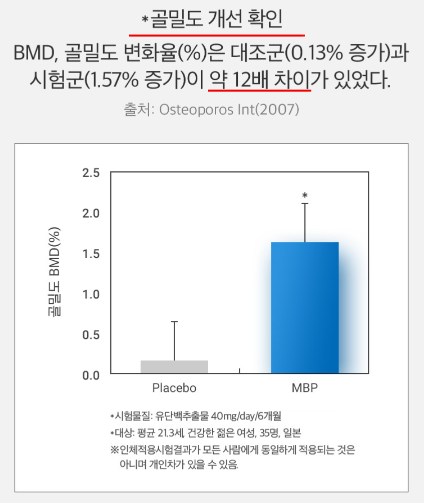 실제 평균 21세의 젊은 여성 35명을 대상으로 시험한 결과 대조군 대비 약 12배의 차이로 골밀도 개선이 확인되었습니다. 또한, 65~86세 건강한 노인여성 79명을 대상으로 골강도를 조사한 결과 MBP를 섭취한 대상이 대조군에 비해 눈에 띄는 골강도 증가가 이루어진 것을 확인하였습니다.