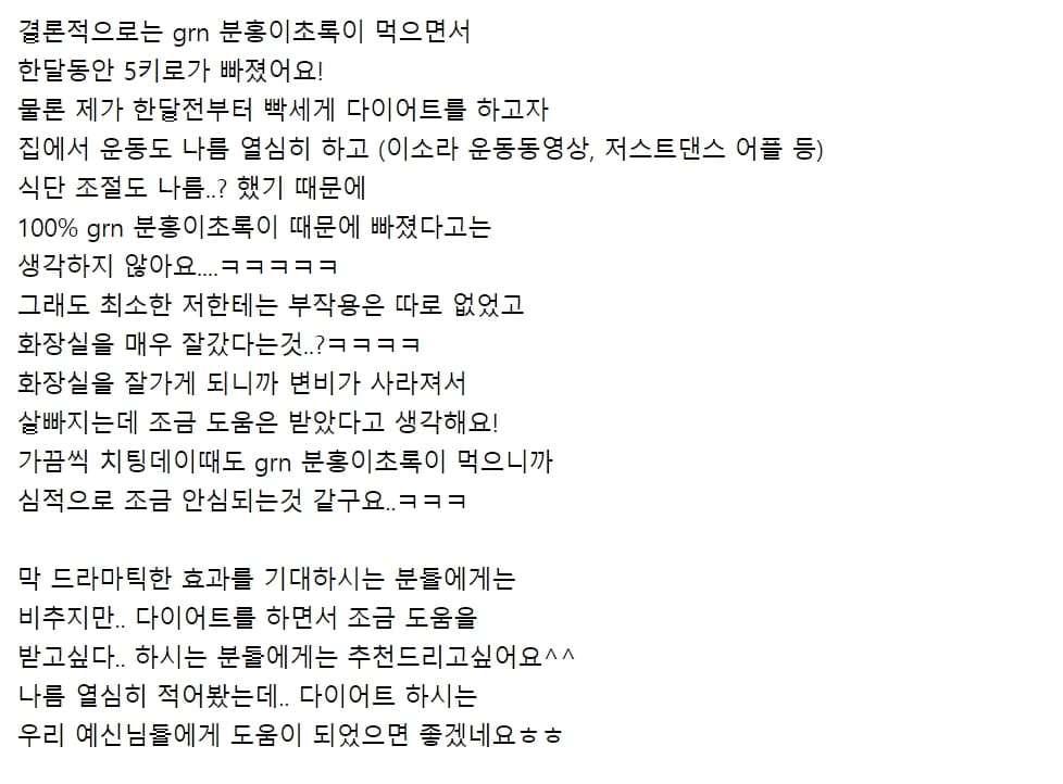 특히 결혼 준비를 하시는 분들이 단기간에 빠르게 체중감량을 원하기 때문에 쓰리데이즈 분홍이 초록이를 드시는 것 같습니다. 드라마틱 하진 않지만 체중감량 효과를 보았다고 하니 참고해주세요.