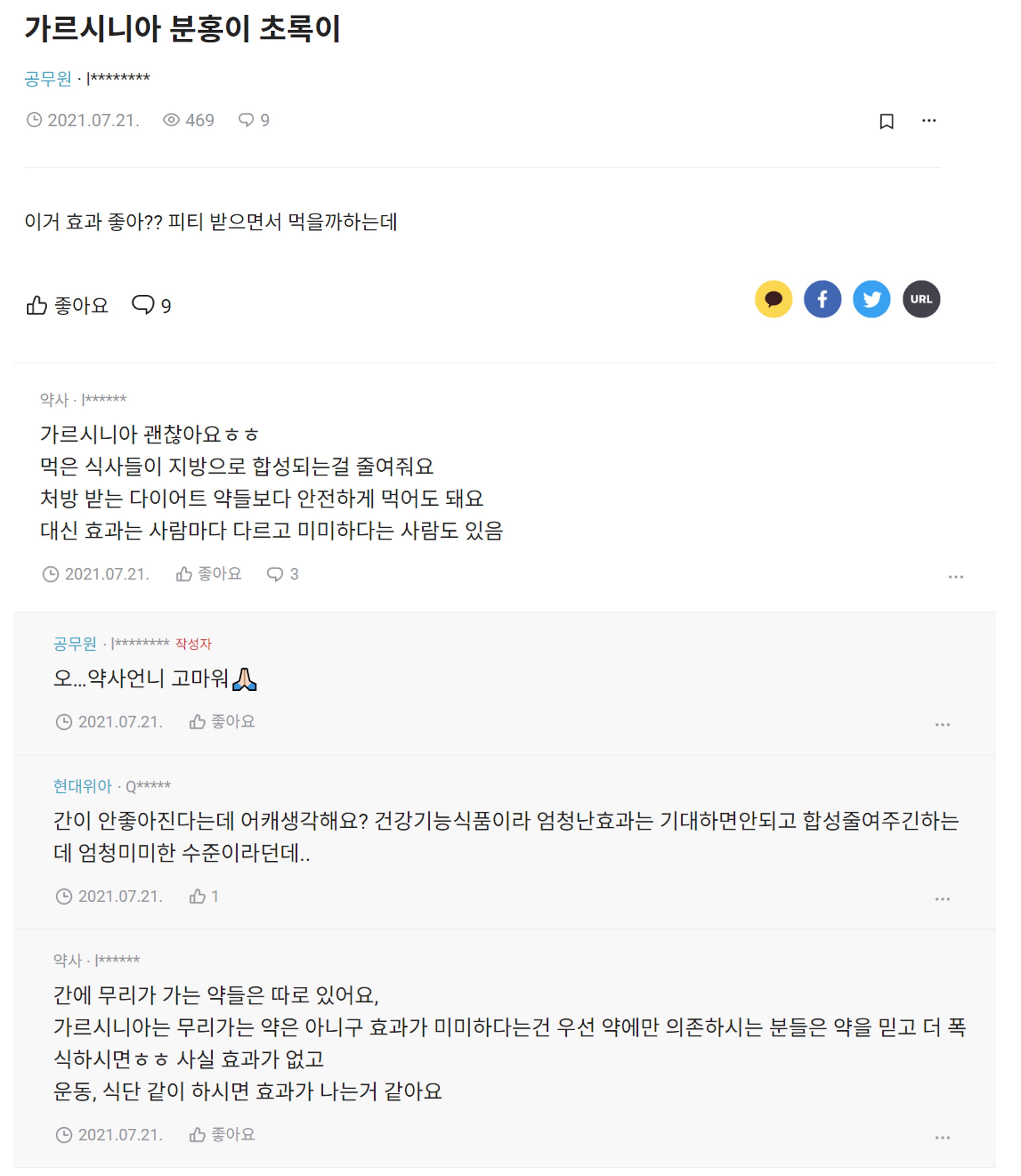 약사가 단 댓글을 보면 분홍이에 함유된 가르시니아가 간에 무리를 주지 않는다고 합니다. 그리고 긍정적인 후기로는 운동과 식단을 같이 하면 효과를 보았다고 하며. 화장실을 잘 가서 좋다는 평이 있습니다.